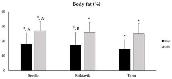 Body fat percentage values in boys and girls from Seville, Reykjavik and Tartu. Data presented as M ± SD; * Statistically significant differences between boys and girls from the same city; A Statistically significant differences between Seville and Tartu; B Statistically significant differences between Reykjavík and Tartu.