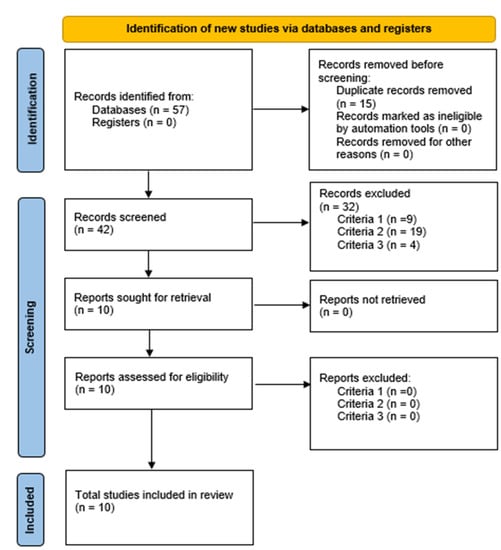 In the initial search, 57 scientific articles were identified, of which 15 were duplicates. After reading by titles and abstracts, 32 studies were excluded for not addressing the inclusion and exclusion criteria, leaving 10 for full-text reading. We finally selected ten articles for this review (Figure 1).
