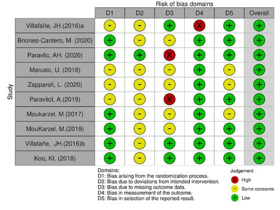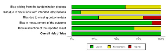Risk of bias analysis revealed that the distribution of biases classified as “low risk”, or “unclear risk” was similar in domains: (D1) selection bias and (D5) reporting bias. In domains (D2) performance bias and (D3) detection bias, a low percentage of articles with “low risk” (1/10 and 3/10, respectively) and a high percentage of articles with “unclear risk” (9/10 and 5/10, respectively) were evidenced. Conversely, in domain (D5) attrition bias and overall risk of bias, high percentages of “low risk” were observed (9/10 and 10/10, respectively) (Figure 2 and Figure 3).