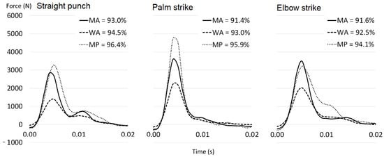 The Friedman ANOVA showed that MP had a lower straight punch (Mean ± SD, 4662 ± 907 N, χ2F (1) = 8, p < 0.01, W = 0.50) and elbow strike (5961 ± 2157 N, χ2F (1) = 12, p < 0.01, W = 0.75) peak force in comparison to the palm strike (6460 ± 1612 N), and no differences between the straight punch and the elbow strike. MA had a lower peak force in the straight punch (4921 ± 1396 N) in comparison to the elbow strike (6047 ± 2482 N, χ2F (1) = 13, p < 0.01, W = 0.22) and no differences in the palm strike (5512 ± 1638 N) to other types of strikes. The WA straight punch peak force was lower than the palm strike (χ2F (1) = 22, p < 0.01, W = 0.42) and elbow strike (χ2F (1) = 12, p < 0.01, W = 0.23) peak force.