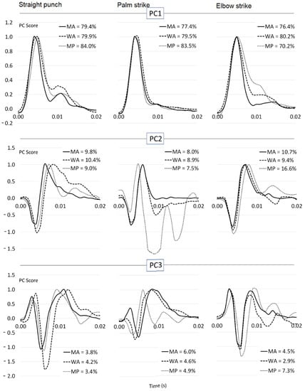 Principal component scores of the first three principal components for direct punch, palm strike and elbow strikes of professional men (MP), advanced men (MA) and advanced women (WA). The percentages describe the variance explained by each principal component.
