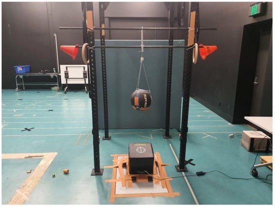 To determine the reliability of the PowerKubeTM, we developed a fixed, steel construction, vertical support system which was permanently mounted to a concrete slab to suspend a weighted mass over both a force platform (Kistler Type 9287, Kistler Instrumente, AG, Winterthur, Switzerland) and a PowerKubeTM (see Figure 1). Following pilot testing, a firm, rounded mass (weighted medicine ball—8.04 kg) (Buffalo Sports, Victoria, Australia) was selected as the impact mass as it would most likely result in high repeatability concerning impact angle given its spherical shape (Figure 1 and Figure 2). The mass was suspended above the force platform and PowerKubeTM using a customized sling and release system that allowed for high release consistency (negligible horizontal movement). A commercial plumb bob was used to ensure the mass drops from the sling support were either dead center on the PowerKubeTM or 40 mm off-center. The plumb bob was used prior to each condition and intermittently during conditions to ensure impacts were consistently delivered to two specific locations on the PowerKubeTM, dead center or 40 mm off-center.