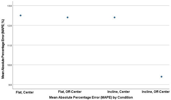The mean absolute percentage error (MAPE) plot (Figure 2) identified the first three conditions. The MAPEs were very similar, ranging from 12.4% to 12.5%; however, the fourth condition was lower at 9.4%. Bland–Altman plots were also produced, which included the 95% LoA between tests (first 40 drops versus second 40 drops) for all four conditions (Figure 2, Figure 3, Figure 4 and Figure 5). The mean impact with center flat strikes (Figure 3) was 697 Watts, with the upper and lower LoA being 779.4 and 616.0 Watts, respectively (SEM 36.4 and 30.3, respectively, MAPE 12.5%). The mean impact with off-center flat strikes (Figure 4) lower at 591 Watts, with the upper and lower LoA being 637 and 544 Watts, respectively (SEM 18.8 and 15.4, respectively, MAPE 12.4%). When the PowerKubeTM was set at an incline, the mean center impact was 452 Watts, with the upper LoA at 526 Watts and the lower LoA at 378 Watts (Figure 5) (SEM 34.7 and 29.0, respectively, MAPE 12.4%). When the PowerKubeTM was at an incline and off-center impacts, the mean impact was 318 Watts with the upper and lower LoAs at 357 and 279 Watts, respectively (Figure 6) (SEM 23.8 and 20.7, respectively, MAPE 9.4%).