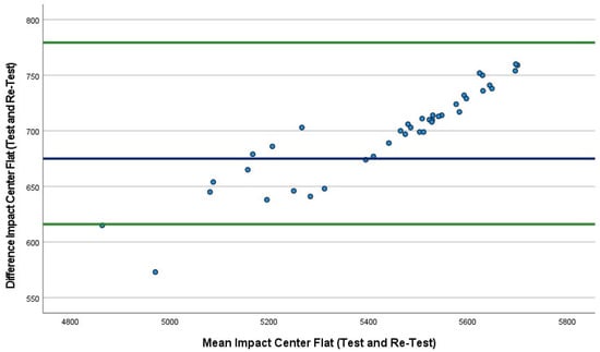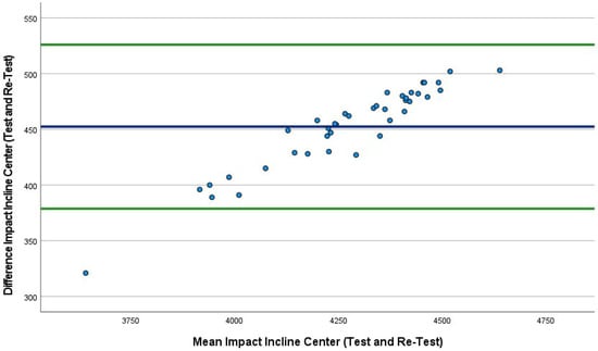 Bland–Altman plot indicating mean (blue line) and 95% limits of agreement (green lines) between incline center trial 1 (40 drops) and incline center trial 2 (40 drops).