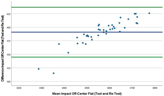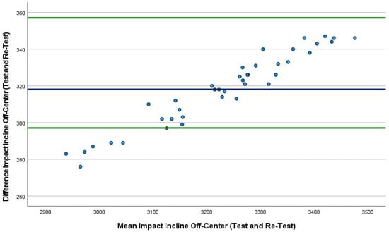 Bland–Altman plot indicating mean (blue line) and 95% limits of agreement (green lines) between incline off-center trial 1 (40 drops) and incline off-center trial 2 (40 drops).