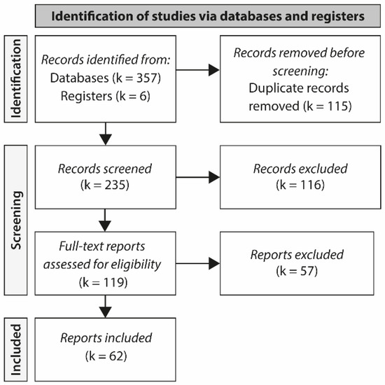 A total of 357 studies were selected from the databases for eligibility appraisal. After assessing the titles and abstracts of all entries, 119 studies were selected for full-text evaluation. As shown in Figure 1, following the screening of the full text of these reports, 62 studies met the inclusion criteria and were comprised in this scoping review.