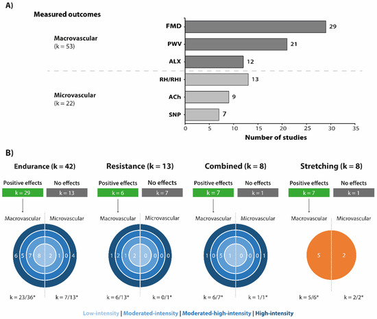(A) Main vascular function outcomes according to exercise interventions. Graph bar presents the three most frequent macrovascular and microvascular measures used in the selected studies. (B) Diagram describing the number of studies that reported positive effects of exercise interventions on vascular function according to outcome category, exercise type, and exercise intensity. * Total number of studies that investigate at least one macro-/microvascular outcome. Acetylcholine-mediated vasodilation (ACh); Augmentation index (ALX); Flow-mediated dilatation (FMD); Pulse wave velocity (PWV); Reactive hyperemia/Reactive hyperemia index (RH/RHI); Sodium nitroprusside-induced endothelium-independent relaxant (SNP).