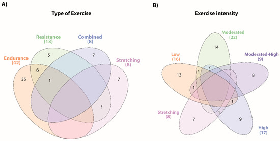 Summary of the main types of exercise training and intensities used in the interventions. The Venn diagrams present the overlap of the distinct types of exercise (A) and the different exercise intensities (B) described in the exercise interventions of the included studies.
