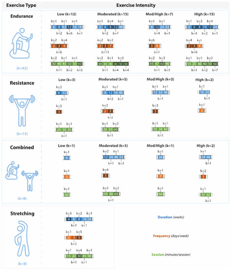 Most of the endurance interventions had a duration of 12 weeks, a frequency of three times per week, and 60 min per session (Figure 4). Regarding resistance training, there was considerable heterogeneity. In these studies, the overall duration of the intervention ranged from 6 to 48 weeks, and the duration of each training session varied between 20 and 60 min, two to three times per week. The duration of the combined exercise interventions ranged between 6 to 52 weeks, with a frequency of 3 days per week and a duration of 60 min per session. Similarly, the stretching interventions also shared a wide difference in training protocol characteristics. Overall, the exercise interventions lasted predominantly 4 to 8 weeks, with five training sessions per week of 30 min each.