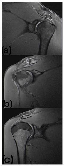 (a) MRI of the left shoulder showing edematous changes at the AC joint. (b) MRI of the right shoulder showing small cystic resorptions near the intertubercular sulcus. (c) MRI of the right shoulder of the same participant shown in (b), showing low attachment tendinopathy of the supraspinatus tendon.