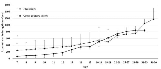 Figure 1 reports mean accumulated training hours for both sports and age groups from the age of seven until the present day. The overall results showed no significant difference in mean accumulated training hours between the freeskiers and the cross-country skiers, except at the age of seven [t(16) = 2.79, p = 0.039, dz = 1.32 (95% CI [0.72, 2.34])]. In total, the mean accumulated hours of training from seven years of age until the time of the survey is 12,162 h for the freeskiers and 10,698 h for the cross-country skiers.