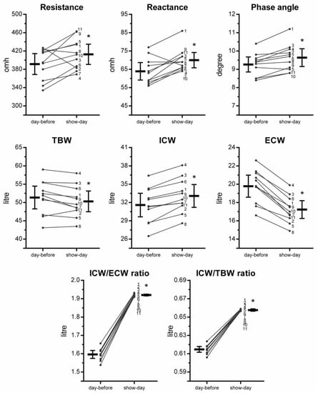 Figure 1 displays the individual values for R, Xc, PhA, TBW, ICW, ECW, ICW/ECW ratio, and ICW/TBW ratio. Significant changes were observed in R (391.5 ± 33.9 omh; 412.7 ± 33.0 omh; observed power [op] = 0.436; p = 0.037; d = 0.60), Xc (63.9 ± 7.1 omh; 70.0 ± 6.2 omh; op = 0.699; p = 0.005; d = 0.83), PhA (9.3 ± 0.6 degree; 9.6 ± 0.7 degree; op = 0.412; p = 0.001; d = 0.58), TBW (51.4 ± 4.6 L; 50.3 ± 4.2 L; op = 0.102; p = 0.028; d = −0.22), ICW (31.6 ± 2.9 L; 33.1 ± 2.8 L; op = 0.323; p < 0.001; d = 0.50), ECW (19.8 ± 1.8 L; 17.2 ± 1.4 L; op = 0.985; p < 0.001; d = −1.39), ICW/ECW ratio (1.60 ± 0.03 L; 1.92 ± 0.01 L; op = 1.000; p < 0.001; d = 9.77), and ICW/TBW ratio (0.61 ± 0.01 L; 0.66 ± 0.01 L; op = 1.000; p < 0.001; d = 8.70) but not in bodyweight (80.8 ± 7.9 kg; 80.2 ± 8.0 kg; op = 0.055; p = 0.158; d = −0.07).