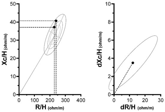 Results for BIVA scores in bodybuilders from day-before to show-day (n = 11). R = resistance; Xc = reactance; H = height (stature, in meter). Left panel: R–Xc graph with mean vector displacement, indicated by the black dots (day-before → show-day), plotted on the reference tolerance ellipses for lean male athletes from Campa et al. [29]. Right panel: day-before to show-day mean vector displacement with 95% confidence ellipses (T2: p < 0.001).