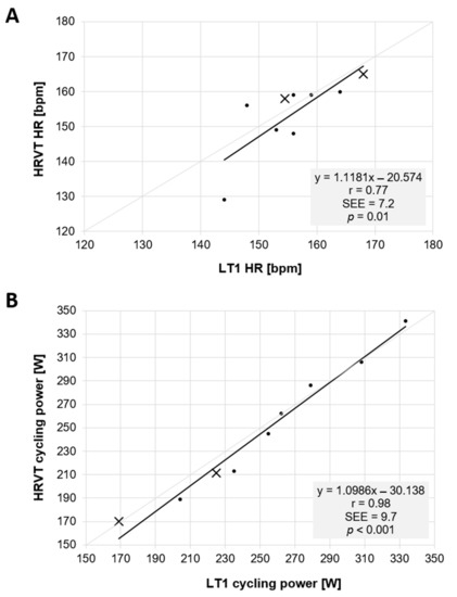 Regression plots for all participant data. (A): Values of LT1 vs. HRVT for HR in bpm. (B): Values of LT1 vs. HRVT for cycling power in W. Bisection lines in light gray. SEE: standard error of estimate; r: Pearson’s r. Points symbolized by X represent female participants.