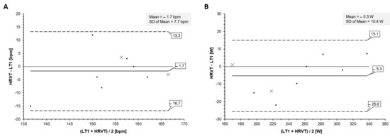 Bland-Altman Plot of LT1 vs. HRVT for all participants. (A): Values of LT1 vs. HRVT for HR in bpm. (B): Values of LT1 vs. HRVT for cycling power in W. Center line in each plot represents the mean difference between each paired value, the top and bottom lines are 1.96 standard deviations from the mean difference. Points symbolized by X represent female participants.
