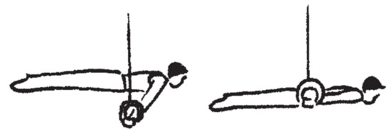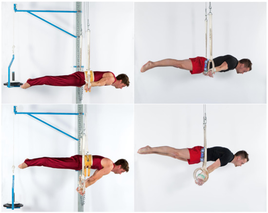 On rings in men’s artistic gymnastics, a maximum of eight static, eccentric and/or concentric strength elements may be performed within a competition routine. According to its difficulty, each element is assigned an element value from A to H as well as corresponding difficulty values (A: 0.1 points to H: 0.8 points) in the code of points [1]. In addition, all elements are assigned to one of the four element groups (EG I: kip and swing elements; EG II: strength elements and hold elements; EG III: swing to strength hold elements EG IV: dismounts) depending on the movement structure. Strength elements are included in two element groups; therefore, these elements are among the most important to be successful on rings. For a technically clean execution of these elements, a high level of specific maximum strength and strength endurance in the upper extremities is required. In order to overcome gravity and to maintain the static (quasi-isometric) positions of strength elements, muscle work is performed that may be similar to eccentric contractions [2]. In order to achieve a maximal execution score, elements must be held for at least two seconds without angular deviations from the correct position or other executional errors. Angular deviations and other execution errors are classified as small (>0° to <15°), medium (15° to <30°) or large (30° to <45°) and lead to a point deduction by the judges (small: 0.1 points; medium: 0.3 points; large: 0.5 points) [1]. Traditionally, specific concentric exercises with dumbbells or barbells or static strength exercises on rings with additional weight or a counterweight device have been used [3,4] to improve the specific strength and the quality of execution of static elements on rings such as swallow (EG II; difficulty value: D; 0.4 points) and support scale (EG II; difficulty value: C; 0.3 points) (Figure 1).