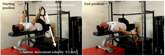 Eccentric isokinetic training with 1080 Quantum. (Left): Starting position with arms in the support scale position (45°). (Right): End position with arms −15° below the horizontal.