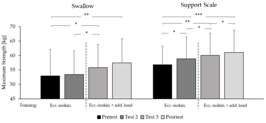 Maximum strength. Mean values and standard deviations for maximal strength (body mass—counterweight or body mass + additional weight) for the swallow and support scale elements when held for 5 s on rings (n = 9). Pre-test: before training; Test 2 and 3: after one and two weeks of training, respectively; Post-test: after three weeks of eccentric-isokinetic (ecc-isokin) training. *: significant change: p < 0.05; **: significant change: p < 0.01; ***: significant change: p < 0.001.