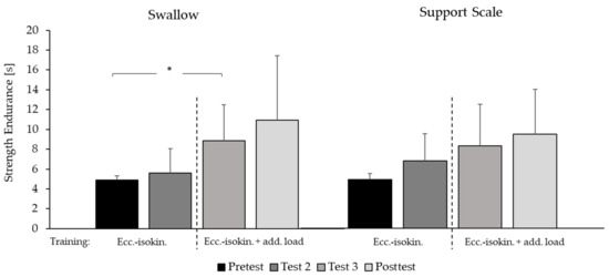 Strength endurance. Mean values and standard deviations for the maximum holding time, with the maximum resistance attained in pre-test (reference) for the swallow and support scale elements on rings (n = 9). Pre-test: before training; Test 2 and 3: after one and two weeks of training, respectively; Post-test: after three weeks of eccentric-isokinetic (ecc-isokin) training. *: significant change: p < 0.05.