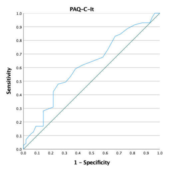 Considering 60 min of MVPA per day as an index of discrimination between active and non-active children, about 56% of the sample were considered active. Sensitivity and specificity were optimized at 2.75 points (sensitivity (59.2%; 95% CI: 47–71%) and 1-specificity (38.2%; 95% CI: 0.25–0.51)) with an associated AUC of 0.62 (95% CI: 0.52–0.72) and Youden index of 0.21. Based on the AUC, the classification accuracy was poor. The specificity value shows the low capacity of the PAQ-C-It to identify non-active children. For more details about statistical analysis, see Table 3.