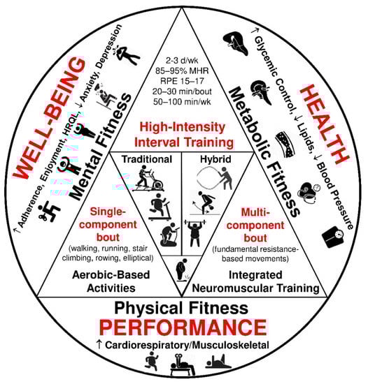 High-intensity interval training (HIIT) for clinical populations, including people experiencing obesity, is generally defined as a cardiovascular exercise strategy composed of repeated bouts of brief, intermittent, intense exercise [85–95% of heart rate reserve (HRR); rating of perceived exertion: 15–17] followed by periods of passive or active recovery (60–70% HRR) [28]. In general, there are two mainly used HIIT program design formats implemented for populations with obesity: (1) traditional, aerobic-based training as a single-component session and (2) hybrid, resistance-based training as a multi-component session (Table 1) [29,30,31,32]. Both HIIT models are feasible, effective, and popular exercise approaches for the masses in the fitness community [33]. According to the American College of Sports Medicine, the role of HIIT in cardiometabolic disease prevention is vital since HIIT shows similar improvements in body composition, glycemic control, blood lipid profile, and blood pressure as MICT in overweight and obese adults [34]. However, emerging evidence suggests that such exercise modes may be demanding for previously inactive individuals with unhealthy weight [35]. Thus, HIIT-based protocols should be adjusted to exercisers’ psychological and physiological profiles aiming to be widely adopted by the masses in a free-living environment [36]. Figure 1 summarizes the effects of HIIT on metabolic health, physical performance, and well-being in overweight and obese adults [13,29,30,31].