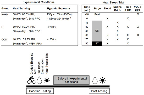 - Rendell, R.A.; Prout, J.; Costello, J.T.; Massey, H.C.; Tipton, M.; Young, J.; Corbett, J. Effects of 10 days of separate heat and hypoxic exposure on heat acclimation and temperate exercise performance. Am. J. Physiol. Regul. Integr. Comp. Physiol. 2017, 313, R191–R201. [Google Scholar] [CrossRef] [Green Version]