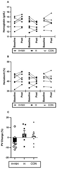 Blood parameters before and after interventions are displayed in Figure 2. A significant group × time interaction between H and H+NH was identified for (Hb) (Two-Group Model, p = 0.043), with H+NH increasing (Hb) by ~2.9% (d = 0.38) and H decreasing (Hb) by ~2% (d = 0.31). The calculated plasma-volume changes demonstrated a trend (p = 0.081) for opposing acclimation response, with H increasing by 3.8% (d = 0.65) and H+NH decreasing by −4.1% (d = 0.78).