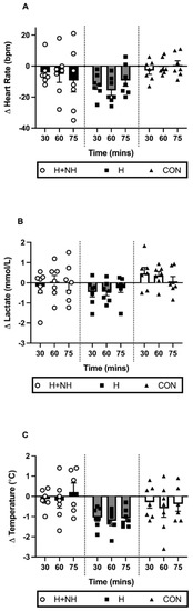 The present study is also not without its limitations. Skin-temperature measures were not included, and core temperature was extrapolated using tympanic temperatures. This measure, taken by the same operator throughout the study, was duplicated to reduce variability. The increases with exercise and heat exposure in the present study were similar to rectal temperature changes previously observed [16,47]. As discussed previously, red cell mass measurements using CO-rebreathing were unsuccessful post-environmental treatment due to equipment and technical limitations and secondary measures (e.g., (Hb) and Hct) were used to approximate the hypoxic adaptations. Though the addition of a control group is the strength of the study design, they did not specifically complete the same daily environmental rides in thermoneutral ‘lab’ conditions as the other groups. However, major outcomes of this group were stable without heat exposure. Given the ‘open-label’ study design of the study, all participants were aware of the designated intervention group. Thus, we cannot discount the possibility of either a placebo or training effect in either or both intervention groups. Finally, we were unable to control for menstrual cycle phase but given a fairly even spread of females across groups (H+NH:2, H:1, CON:1), and individual female data showing minimal differences from the group mean, it is unlikely to significantly impact the key findings.