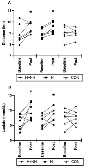 Individual and average values for (A) Total distance covered during the 15 min maximal effort time trial portion; (B) peak lactate levels following time-trial portion before (baseline) and after (post) heat exposure. * Significantly different to baseline (p < 0.05).