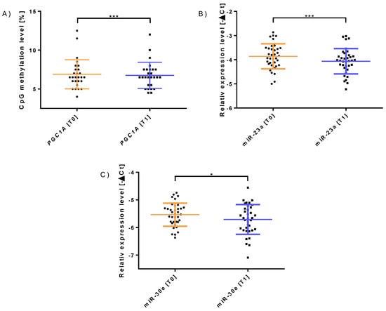 Furthermore, the 12-week intervention changed the miR-23a (n = 36, p = 0.023, 0.92-fold, Figure 2B) and miR-30e (n = 36, p = 0.047, 0.94-fold, Figure 2C) expression significantly. Participants whose capillary blood samples were collected 24 to 32 h after their last training session showed a change in PGC-1α methylation (n = 27, p = 0.024, Figure 2A) and expression of miR-23a (n = 27, p = 0.028, Table 4). Furthermore, there were no differences in PGC-1α methylation, mtDNA, miR-23a, and -30e expression between sex, smoker (n = 11, 30.6%) or non-smoker (n = 25, 69.4%) status, or age, so we included the entire study population for further analysis.