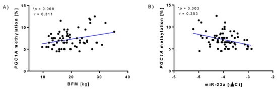 A positive correlation between PGC-1α methylation and body fat mass (BFM, kg) was obtained (p = 0.008, Figure 3A). As described in the literature, increasing PGC-1α methylation negatively correlated with miR-23a expression (p = 0.003, Figure 3B).