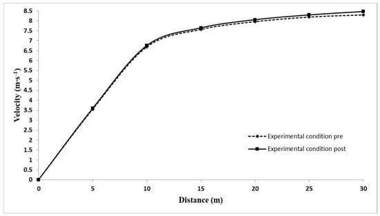 An interaction effect (condition x time) was noticed in running velocity at 5–10 (F = 5.46, p = 0.039, η2 = 0.33, OP = 0.57), 10–15 (F = 5.07, p = 0.046, η2 = 0.32, OP = 0.54), 15–20 (F = 5.62, p = 0.037, η2 = 0.34, OP = 0.58), 20–25 (F = 5.86, p = 0.034, η2 = 0.40, OP = 0.68) and 25–30 m (F = 7.15, p = 0.022, η2 = 0.40, OP = 0.75) distance intervals. Post hoc interaction effect analysis indicated that the EXP achieved significantly higher running velocity following resisted sprints at 5–10 (MD = 0.06 ± 0.03 m∙s−1, p = 0.032, ES = 0.71), 10–15 (MD = 0.08 ± 0.02 m∙s−1, p = 0.006, ES = 0.98), 15–20 (MD = 0.08 ± 0.02 m∙s−1, p = 0.004, ES = 1.06), 20–25 (MD = 0.10 ± 0.03 m∙s−1, p = 0.015, ES = 0.83) and 25–30 m (MD = 0.09 ± 0.03 m∙s−1, p = 0.014, ES = 0.84) (Table 1, Figure 1). CON did not show any significant difference in running velocity (Table 2). No significant interaction and main effect were found in running velocity at 0–5 m distance interval for both EXP and CON.