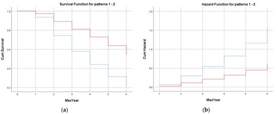 Competitive (red) and recreational (blue): (a) Survival function at the mean for the competition level. The vertical axis shows the probability of survival. The horizontal axis represents time-to-event data. (b) Hazard function at the mean for the competition level. The vertical axis shows the cumulative hazard, equal to the negative log of the survival probability. The horizontal axis represents time-to-event data.