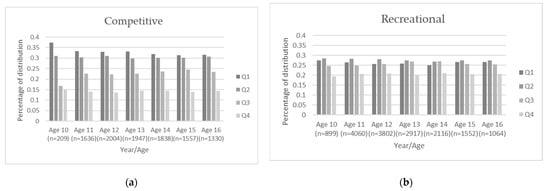 Birth distribution by quartile and chronological age (10–16 years). (a) Competitive players; (b) Recreational players. Note: The majority of participants ages 10–12 years would be classified as “mini outdoor” according to Ontario Soccer’s organizational structure and are therefore not represented.