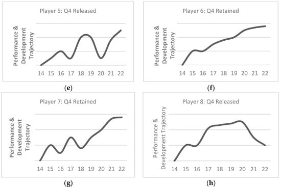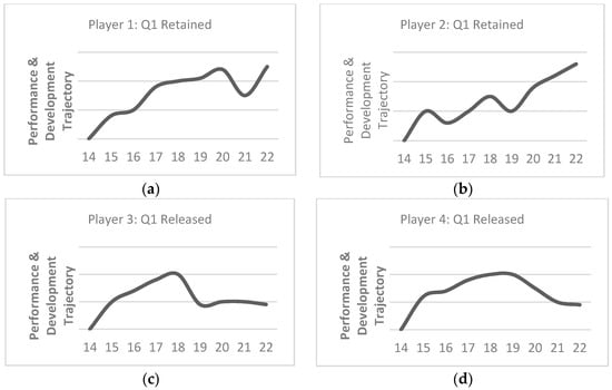 Across the sample it appeared that, regardless of birthdate in the selection year, there did not appear to be a pattern in the volume or intensity of the challenges faced on the journey to the professional game. Importantly however, this did not appear to be the case for players that were subsequently released. It appears that players born in Q1 and subsequently released experienced a challenge-free journey prior to academy entry at 16 years of age. Players born in Q4, and subsequently released, plotted their experiences in a similar manner. This contrasted significantly with the experiences of retained athletes with first and fourth quartile birthdates, who plotted a consistent series of bumpy challenging experiences prior to and through the academy system.