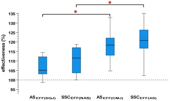 The respective effectiveness of the SSC imposed by the countermovement of the lower extremities (SSCEFF) in the arm (AS) and no arm swing (NAS) vertical jump tests was evaluated according to Equations (3) and (4):