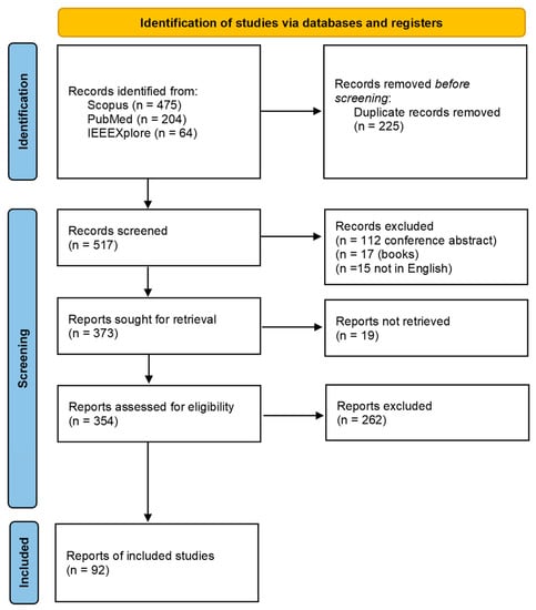 After removing all duplicates, 517 publications were considered. The application of the exclusion criteria reduced the number of papers to 92, with the publication rate per year increasing from 0 per year in 2000 to 13 in 2018. The PRISMA workflow is given in Figure 1. One limitation of this selection is the use of a database. For example, the Web of Science database was not used. However, regarding overlapping publication bibliographies and databases, the current selection seemed to permit the consideration of a sufficiently large number of publications in the field for performing this review.
