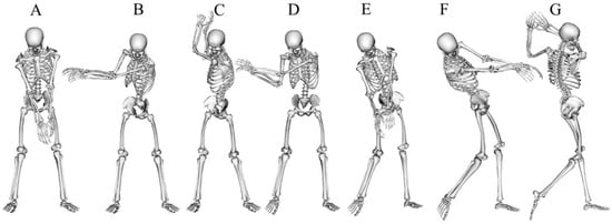 Golf swing sequence [25,26], at different instants: address (A), mid-backswing (B), top of backswing (C), mid-downswing (D), impact (E), mid-follow-thorough (F), finish (G).