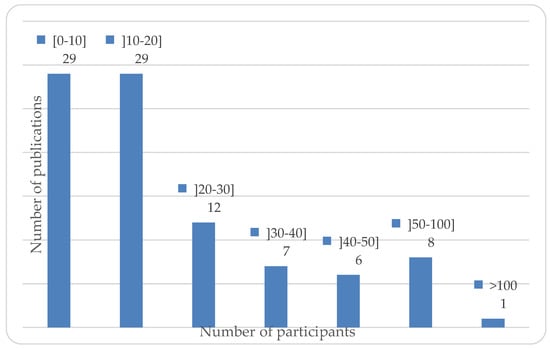 Thirty-one articles considered at least one professional golfer. Recreational golfers were often split into two categories: 37 highly skilled (h < 5) golfers and 27 low-skilled golfers; however, two did not provide explicit information about golfers’ skills. The studied groups varied in size from one participant, that is, a case study [34,35,36,37], to a mixed-group analysis of 308 [38]; the majority of studies included between 1 and 20 participants (n = 58/92). The number of participants per publication is shown in Figure 3.