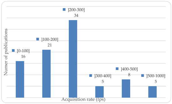 The acquisition frequency varied from 3 to 1000 frames per second (fps). The lowest frequencies were observed in three studies using X-ray technologies (3–10 fps) with a very limited number of acquired values. The majority of the studies (55 articles) reported acquisition frequencies ranging between 100 and 300 fps, but three studies did not provide any information about this. A histogram of the acquisition frequencies is shown in Figure 4.