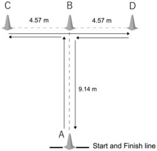 The Agility T-test was administered by using the modified Semenick procedure (Figure 1) [25]. Each participant performed the test, starting from point A and sprinting forward to point B (9.14 m). Subsequently, each participant performed a side run to the left toward point C (4.57 m) and then in the opposite way to point D (9.14 m). Finally, each participant, by running backward, reached point A. Three trials were performed, and the best was used for the statistical analysis [26].