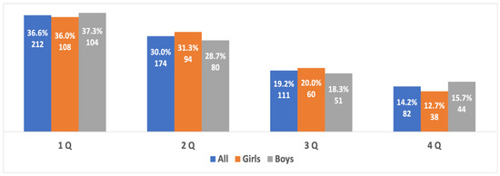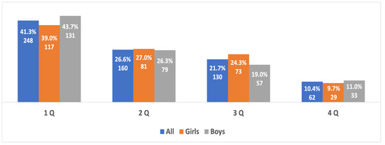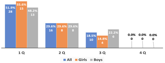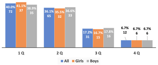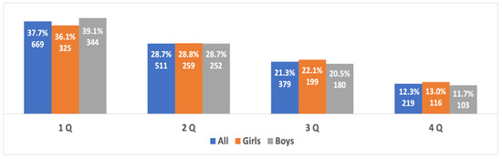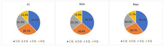 The representation of young athletes born in different quartiles was analyzed. A wide distribution of the RAE was revealed both in the general sample and in boys and girls. The percentage of “early-born” athletes was 37.7% while only 12.3% were “late-born” athletes (see Figure 1).