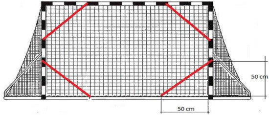 Standardized anthropometric instruments were used to measure the morphological characteristics. The measurements were taken according to a predetermined International Biological Program (IBP) [22]. To evaluate the morphological characteristics, eight variables were measured: body height, body mass, body mass index, arm length, upper arm length, lower arm length, the planimetric parameter of the hand, and hand length [23]. Height was measured to the nearest 0.1 cm using a fixed stadiometer (Seca, Leicester, UK) and weight was measured to the nearest 0.1 kg with an electronic weighing machine (HD-351, Tanita, Illinois, USA). The body mass index was calculated using the standard formula: BMI = body mass (kg) ÷ body height2 (meters). Length measures were measured to the nearest 0.1 cm, and taken with the Martin anthropometer (GPM, Bachenbülach, Switzerland). At the same time, to evaluate the situational precision of the handball players, two standardized situational-motor tasks of a composite type were used, selected on the basis of existing studies: precision of the throw from a standing position on both legs from 7 m, and precision of the throw from a jump at 9 m [24,25,26,27]. The protocol is the same for both tests, and the target is a unilateral triangle whose sides are 50 cm in length, while the hypotenuse is an elastic band 5 cm wide (Figure 1). Each test consists of seven attempts of four shots each into every corner of the goal (the participant makes the shots in the following sequence: the upper left-hand corner, the upper right-hand corner, the lower left-hand corner, the lower right-hand corner). Every shot that landed within the triangle carried two points, the ones that landed on the frame of the triangle one point, and a miss carried zero points. The result represents the sum of all the points from all seven attempts.