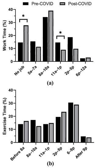 (a) Work-shift start times before and after COVID-19-related restrictions. (b) Exercise times before and after COVID-19-related restrictions. * indicates potential changes using confidence intervals based on independent binomial distributions.