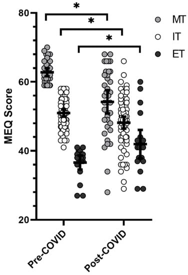 A significant time × chronotype interaction was shown for MEQ (F = 16.395, p < 0.001), with MT individuals indicating changes in response to COVID-19 of −8.557 units (95% confidence interval = −4.392 to −12.722 units; p < 0.001; d = −0.871), IT individuals indicating changes of −2.315 units (95% confidence interval = −0.675 to −5.306 units; p = 0.044; d = −0.444), and ET individuals indicating changes of +4.714 units (95% confidence interval = −10.423 to −0.995 units; p = 0.044; d = 0.530). Chronotype shifts before and after COVID-19 are shown in Figure 2.