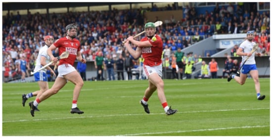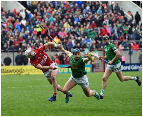 Hurling is an amateur sport native to Ireland. It is one of the national sports governed by the Gaelic Athletic Association (GAA) since its inauguration in 1884 [1,2]. Inter-county (elite) hurling competitions began in 1887, with the premier competition being the All-Ireland Championships [2]. National interest in the sport is significant, illustrated by the capacity crowds in the latter stages of the All-Ireland Championships, with over 82,000 spectators present in Croke Park on All-Ireland finals day. In recent decades, the popularity of Gaelic games has expanded internationally. The All-Ireland finals in 2020 were viewed in over 170 countries via the GAA’s national streaming service GAAGO. Hurling is an intermittent, high-intensity team sport competed by two teams, each having 15 players on a pitch (130–165 m long) at any one time [3,4,5]. During a game, a wide range of offensive and defensive skills are executed at high speed. These range from striking the ball in the air (Figure 1) or on the ground, lifting, catching, and fielding the ball, and hooking or blocking an opponent (Figure 2) when striking the ball [6,7]. Elite hurling consists of inter-county players, whereas sub-elite hurling comprises club-level players. An elite match has a 70-min duration (2 × 35 min halves), with a sub-elite game being 60 min in total (2 × 30 min halves); additional time is at the discretion of the officials [8,9]. The games consist of a goalkeeper and five outfield positional lines (full-back, half-back, midfield, half-forward, and full-forward), with the aim being to outscore the opposition, which results in a game that ebbs and flows in line with match-play actions. O’Brien, Martin, and Bradley [10] observed that the winning team has a higher total shot count (40), shot count from open play (29.5), and shot efficiency from both open play (61%) and dead balls (77%). Hurling is considered to be the oldest of the stick-and-ball games, and is thought to have been the original root of hockey in its various forms [11]. The game has been described as one of the world’s most dynamic and skilled field games [12]. Hurling is played with a small ball and a curved wooden stick. The ball or “sliothar” is composed of cork surrounded by leather, and is similar in size to a hockey ball but with raised ridges and can be propelled up to 160 km·h−1 [13]. The goalposts are the same shape as those on a rugby pitch, with the crossbar lower than in rugby and slightly higher than in soccer. To score, the hurler must put the ball over the crossbar with the hurley for one point, or underneath it and into the net for a goal. A goal is the equivalent of three points.