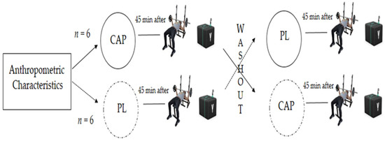 A randomized, double-blind, placebo (PLA)-controlled, crossover experimental design was used in this study. Using a random number generator, each participant took part in two experimental trials at the same time of day and under laboratory-controlled conditions (21.4 ± 0.5 °C dry temperature; 30.5 ± 5.5% relative humidity). Experimental trials were separated by one week to allow complete recovery and CAP washout [15] (Figure 1). The subjects and investigators were blinded to the substances ingested and results of MPO and PV.