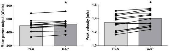 Comparison between effect of acute placebo (PLA) and capsaicin (CAP) ingestion on mean power output (left) and peak velocity (right) across 4 sets of 5 repetitions of free bench press at 60% of body mass. Data are presented as overall mean (bars) and horizontal lines represent individual data. * = statistically significant difference between CAP and PLA conditions.