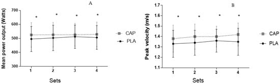 Figure 3 illustrates the comparison between CAP and PLA conditions on MPO and PV for each set. CAP condition was significantly higher compared to each respective set for the PLA condition. There was a significant main effect of condition for MPO (F = 30.886, p = 0.001) and PV (F = 43.238, p = 0.001), but not an interaction for either MPO (F = 0.848, p = 0.49) or PV (F = 1.142, p = 0.34).