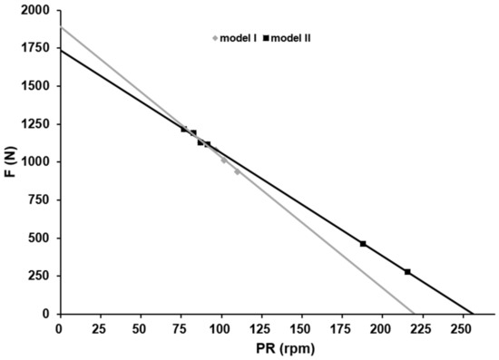 Although both models exhibited high-to-excellent linearity, statistically significant differences could be observed. Maximal force (1507.51 ± 257.60 N and 1384.35 ± 276.84 N; p < 0.002; d = 2.555) and maximal net power Pmax (1499.54 ± 373.17 W and 1623.84 ± 84; p<0.017, d = −1.711) were statistically significant higher and the slope of the function (aI = −6.78 ± 1.17 and aII = −5.24 ± 1.11; p < 0.003, d = −2.401) and PRmax (223.73 ± 27.11 rpm and 264.59 ± 23.17 rpm; p < 0.004; d = −2.427) statistically significant steeper with model I than model II. Both linear regressions produced high coefficients of determination, with R2 amounting to 0.93 0.06 for model I and to 1.00 for model II. Model II thus showed a higher, almost ideal explained variance (p < 0.003, d = −2.427).